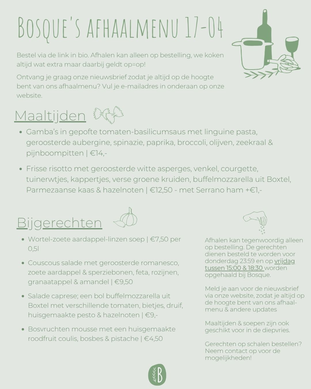 Om de week koken we bij Bosque een menu met verse afhaalmaaltijden. De maaltijden dienen besteld te worden en kunnen op vrijdag afgehaald worden tussen 15.00 en 18.30. Druk op de link hieronder om naar de bestelpagina te gaan.